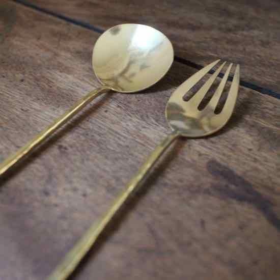 デザインはシンプルですが、手仕事ならではのディテールが個性として現れています。使ううちに色合いや質感が変化してゆくのも真鍮素材の魅力。愛着を持って使い続けられるカトラリーです。のため、経年変化の見られるお品です。その辺りも楽しんで是非使い込んでいただきたいです。